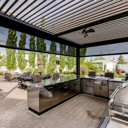 • Complete outdoor room. Add motorized screens, heaters, fans, and glass partitions