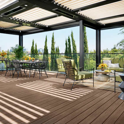The StruXure Pergola X isn't just another louvered pergola; it's an award-winning outdoor living space system. Pair our motorized louvered roof pergola with glass partitions, MagnaTrack screens, and composite decking to create a screened-in porch or all-season patio enclosure.